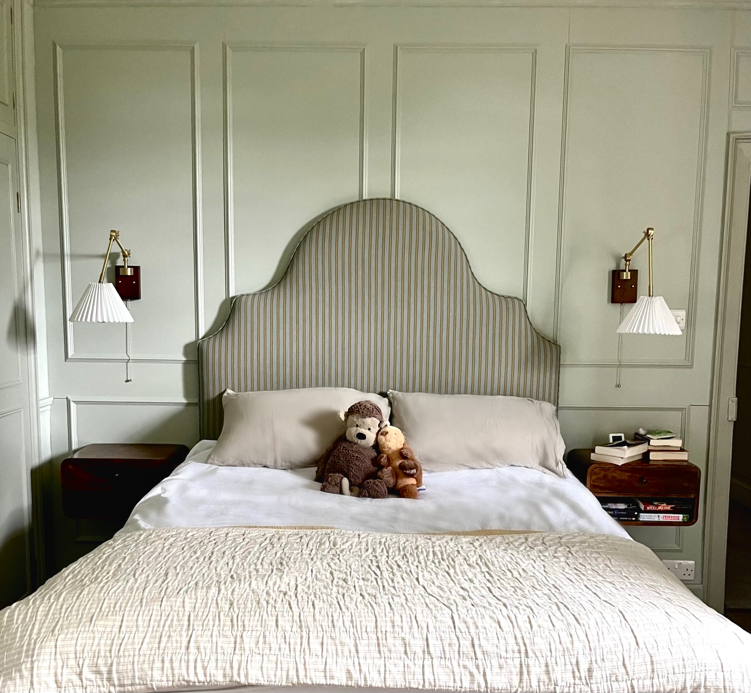 We took the room back to its bare bones and as the room lacked the character we were looking for, we added panelling to the walls, some bespoke joinery and a headboard, new lighting and carpet as well as a muted but calm palette to compliment the dark wood tones. Needless to say, we are very happy to report back that he loved it!